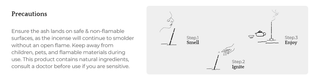 Use in a well-ventilated area and ensure that falling ash will not cause any issues. Please note that a burning incense stick may continue to smolder even without an open flame. Keep away from children, pets, curtains, and other flammable materials. If incense particles accidentally get into your eyes, rinse carefully with water. This product contains natural floral ingredients; sensitive individuals should consult a doctor before use.